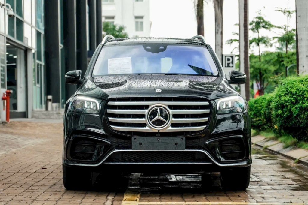 Mercedes-Benz GLS 450 4MATIC được trang bị gói ngoại thất AMG thể thao đi kèm lưới tản nhiệt kích thước lớn với 2 nan ngang mạ chrome đục lỗ, tâm điểm là ngôi sao ba cánh dạng 3D nổi bật ở giữa. Cản trước được viền mạ chrome sáng bóng cùng hai hốc gió được tăng tối đa kích thước, dạng 2 nan ngang màu đen làm tăng thêm sự hầm hố, khí động học cho xe.